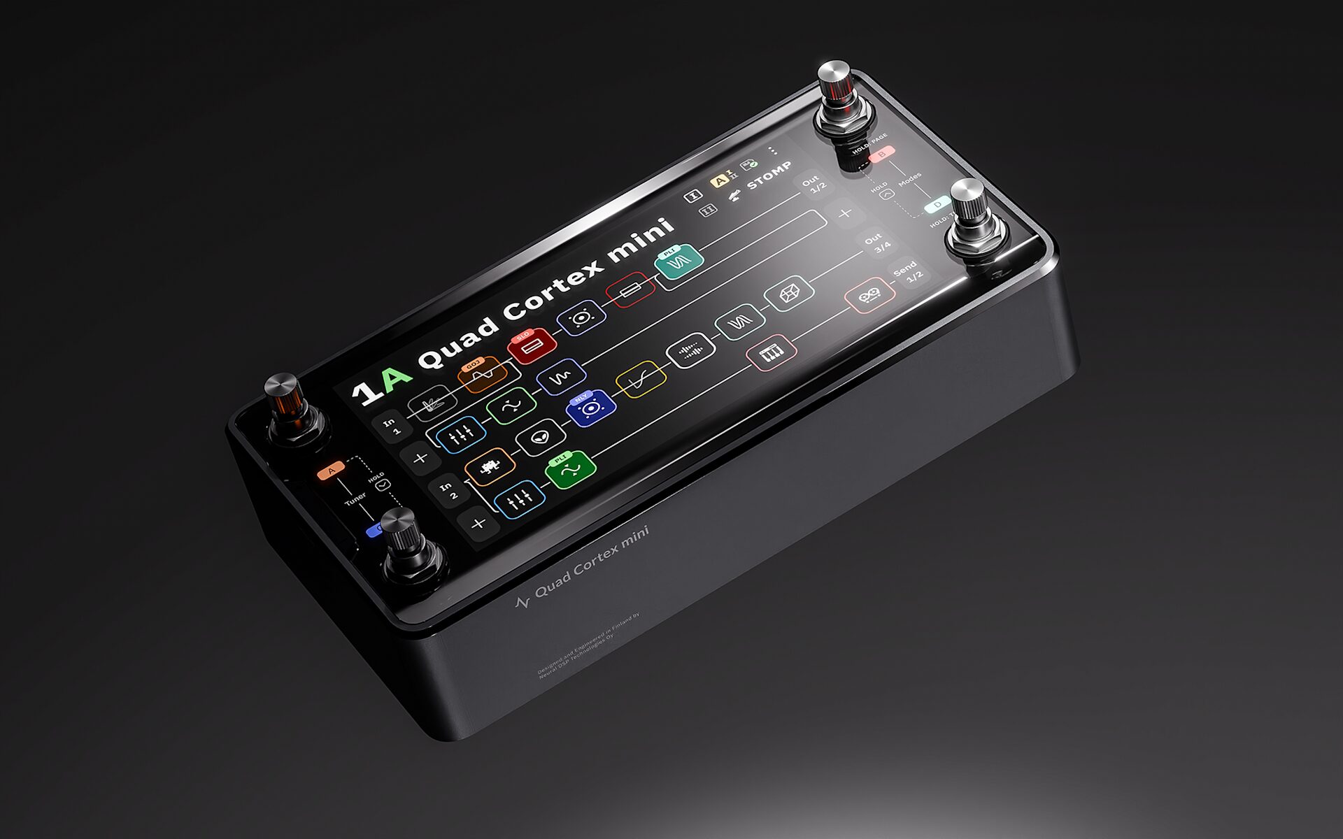 The Quad Cortex mini is engineered to deliver the full functionality of the original model while reducing its physical size by over 50%. With dimensions of just 22.8 x 11.8 x 6.5 cm and a weight of 1.5 kg, this processor is perfect for musicians who need a reliable solution for pedalboards, desktop studios, compact racks, and travel setups. It features a 7-inch touchscreen interface, similar to the flagship model, complemented by four stainless-steel rotary footswitches that allow for intuitive control during both editing sessions and live performances.